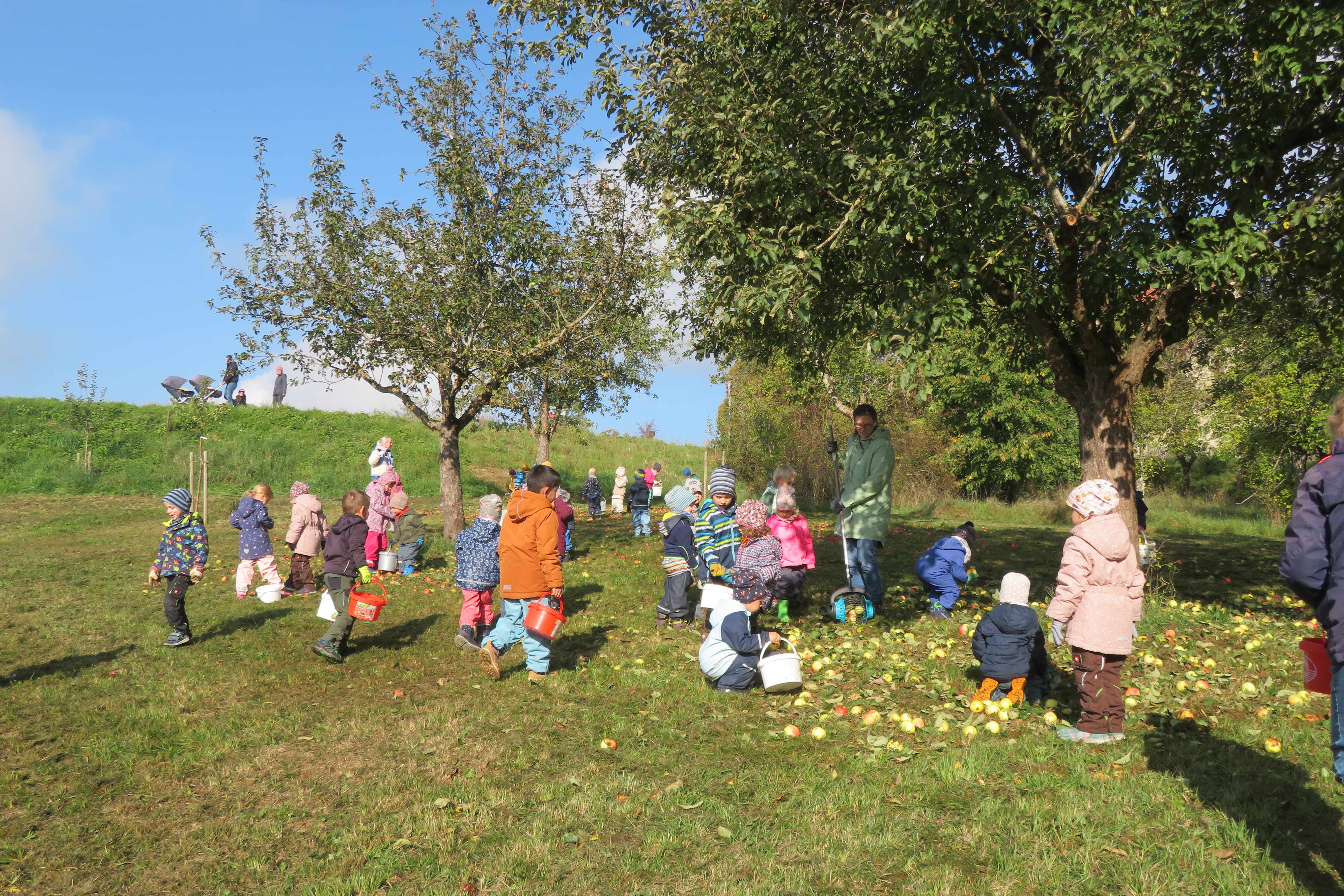 Wenn die Blätter bunt werden und es nach Herbst duftet, heißt das bei uns „Altheimer Zwergen“: Auf geht’s zum Äpfel sammeln! Mit kleinen Händen, großen Körben und noch größerer Begeisterung haben wir uns auf den Weg zur Apfelwiese gemacht. „Schau mal, lauter Äpfel!“, rief ein Zwerg, während der Andere schon den nächsten Apfel entdeckte und sein Körbchen fleißig füllte.
